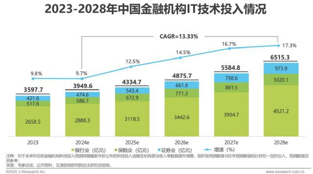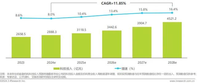 随着数智化转型进程的推进,国内金融机构的科技感知力、产品理解力逐步提升,机构内部的数智化平台建设与信创系统切换稳步推进,在历经后疫情时代短暂的市场萎靡之后,近年国内金融行业逐步回援,三大核心市场的营收表现、利润情况均有提升,以金融大模型为代表的新兴生产力的崐起进一步推动了金融市场的科技需求,多项科技能力的联动与创新业务常态化运作将成为新时代的科技主题,从市场规模与增速的角度来看,国内金融科技市场的整体发展优于预期,2025年作为多项发展规划下的关键节点年份将开启新一轮的高速成长时代,预计市场整体将以约13,3%的复合增长率高速增长,2028年国内金融机构的科技投入规模或将突破6500亿元。