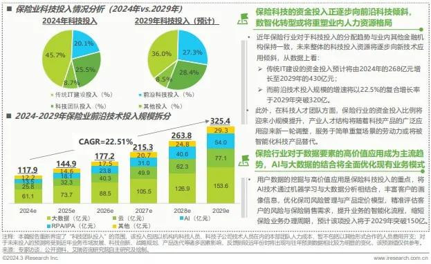 近年随着国内人口老龄化问题的加深与居民保险意识的提升,国内保险市场在需求端的推动下整体向好发展,原保险保费收入实现连续三年增长,以2.01%的增速于2024年达到5.7万亿元,总资产规模突破35万亿,成为自2017年以来的最高增长。业务市场的优异表现极大地促进了保险科技行业的发展,以空间信息技术、生成式AI、物联网、人工智能识别为代表的前沿技术,在风险定价、便捷理赔、个性化客服、精准营销等领域充分发挥其科技赋能效用,围绕数据要素价值的挖掘推动安全合规条件下风险信息数据的共享,串联保险行业多家主体机构,为用户带来方便快捷的全新服务体验。2025年作为《保险科技“十四五”发展规划》的关键年份,在技术投入比例等相关政策要求的指导下,预计2025年投入规模将以14.6%的增速突破670亿元,未来新阶段的发展规划或将关注保险科技场景应用、合规监管等细节要求,推动保险与科技的深度融合,2028年国内保险业科技投入规模预计将突破1000亿元。